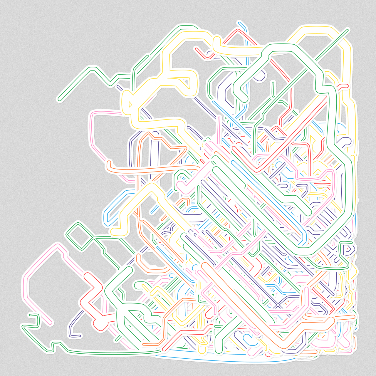 Transit is an exploration of public transport maps that could never possibly happen, generated by transforming data from the world's most relevant systems into a dense conglomerate of vibrant colorful lines.